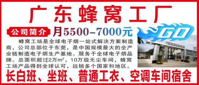 【涨价啦】广东蜂窝工厂招聘,长白班、月薪5500-7000元,包吃包住不扣钱,16岁以上可报名~